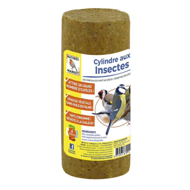 Les différents ingrédients du cylindre (maïs, huile végétale, avoine) feront saliver bon nombre d'espèces d'oiseaux, spécialement les mésanges, acrobates dans l'âme, les sitelles, ou le pic épeiche... Les différentes saveurs permettent à vos invités d'avoir une alimentation variée et équilibrée !