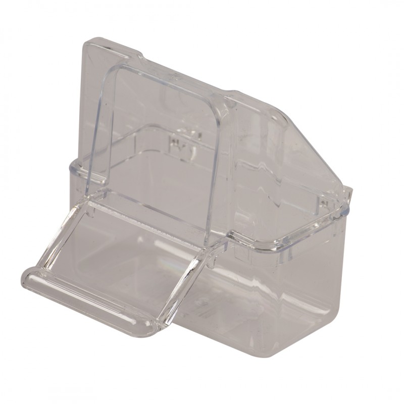 Mangeoire transparente en plastique. Facile à placer dans la cage grâce aux crochets.