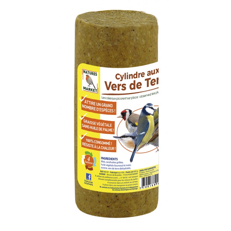 Les différents ingrédients du cylindre (maïs, huile végétale, avoine) feront saliver bon nombre d'espèces d'oiseaux, spécialement les mésanges, acrobates dans l'âme, les sitelles, ou le pic épeiche...