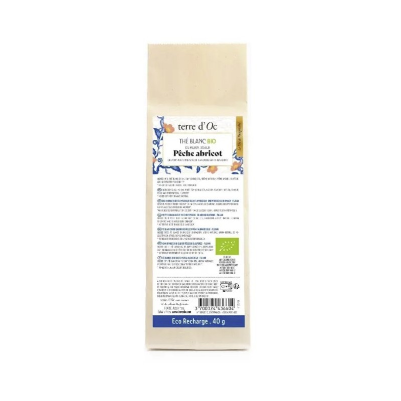 MENTIONS OBLIGATOIRES: Ingrédients : thé blanc Bai Mu Dan* (Chine) 80%, arôme naturel d'abricot*, arôme naturel de pêche*. *Ingrédient issu de l’agriculture biologique.