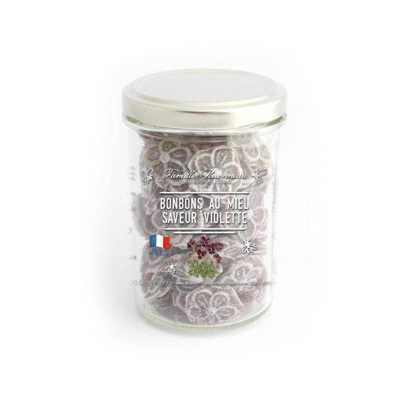 MENTIONS OBLIGATOIRES: Ingrédients: Sucre. sirop de glucose de blé. miel 12%. acidifiant: acide citrique. arôme naturel (pour information: violette). concentré (carotte. hibiscus). colorant naturel: curcumine (E100). Conseils de conservation: Température ambiante. dans un endroit sec. Allergènes: Absence. Traces éventuelles de lait. arachides. amandes et noisettes. Acides gras saturés (g): <0.1 Energie (Kcal): 376 Energie (Kj): 1576 Glucides (g): 93.7 Matières grasses (g): <0.1 Protéines (g): 0.2 Sel (g): <0.1 Sucres (g): 74