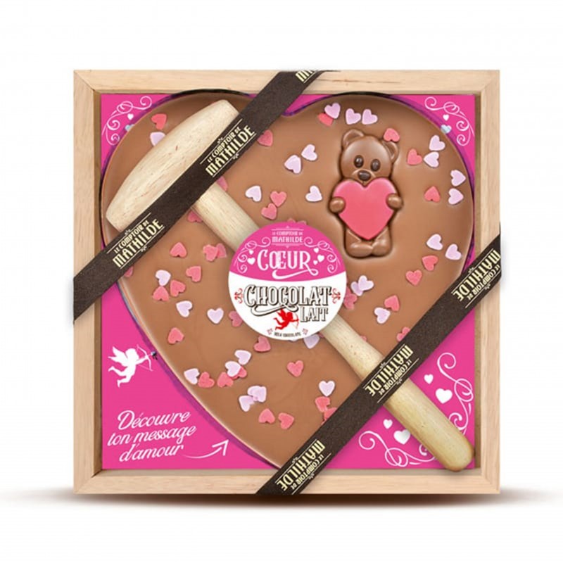 MENTIONS OBLIGATOIRES: Chocolat au LAIT 92,85% (sucre, beurre de cacao, poudre de LAIT entier, pâte de cacao, émulsifiant : lécithine de SOJA, arôme naturel de vanille. Cacao : 33% minimum), décor chocolaté 3,91% (sucre, beurre de cacao, LAIT entier en poudre, pâte de cacao, LAIT maigre en poudre, concentré (carotte), émulsifiant : lécithine de SOJA, arôme naturel de vanille, colorant : E120), décor en sucre 3,24% (sucre, farine de riz, huile de riz, fécule de pomme de terre, arôme, jus concentré de betterave rouge, colorants : E101, E120).