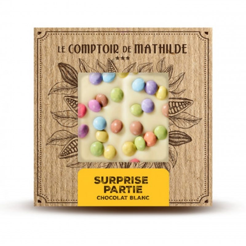 MENTIONS OBLIGATOIRES: Chocolat blanc 84,4% (sucre, beurre de cacao, poudre de LAIT entier, poudre de LAIT écrémé, émulsifiant : lécithine de SOJA, arôme), bonbons de chocolat au LAIT dragéifiés 15,6% (sucre, beurre de cacao, LAIT écrémé en poudre, pâte de cacao, matière grasse de LAIT anhydre, farine de BLE, petit-LAIT filtré en poudre, amidon de riz, émulsifiant : lécithines, concentrés de fruits et de plantes (carthame, radis, carotte noire, citron, hibiscus), concentré de spiruline, agent d'enrobage : cire de carnauba, cire blanche d'abeille), arôme naturel de vanille).