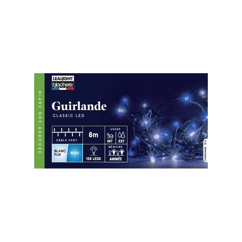 Guirlande Flicker Light®Led Blanc Pur/Bleu Câble Vert 31V Clignotant/Pour Intérieur Et Extérieur 8M-128L-BLACHERE