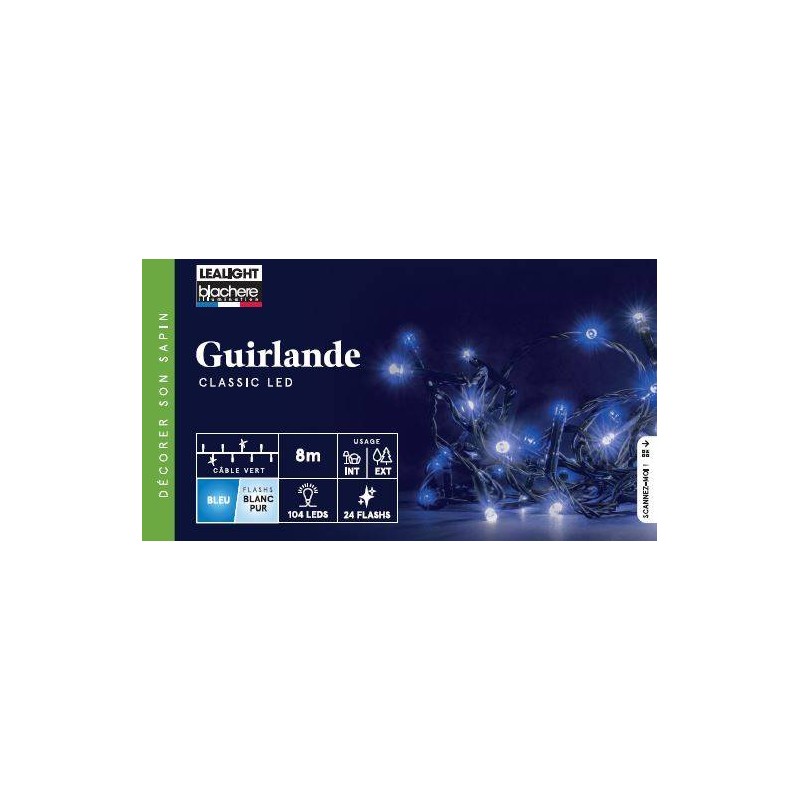 Guirlande Flicker Light®Led Blanc Pur/Bleu Câble Vert 31V Ampoules Flash/Pour Intérieur Et Extérieur 8M-128L-BLACHERE