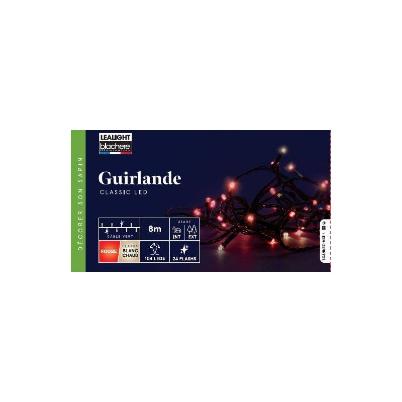 Guirlande Flicker Light®Led Rouge/Blanc Chaud Câble Vert 31V Ampoules Flash/Pour Intérieur Et Extérieur 8M-128L-BLACHERE