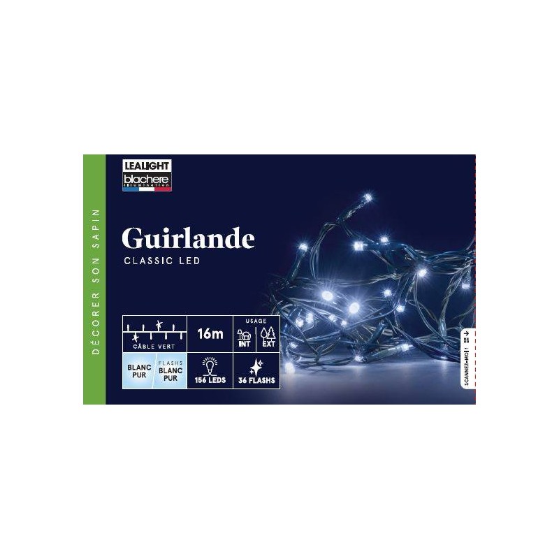 Guirlande Flicker Light®Led Blanc Pur Câble Vert 31V Ampoules Flash/Pour Intérieur Et Extérieur 16M-156L-BLACHERE