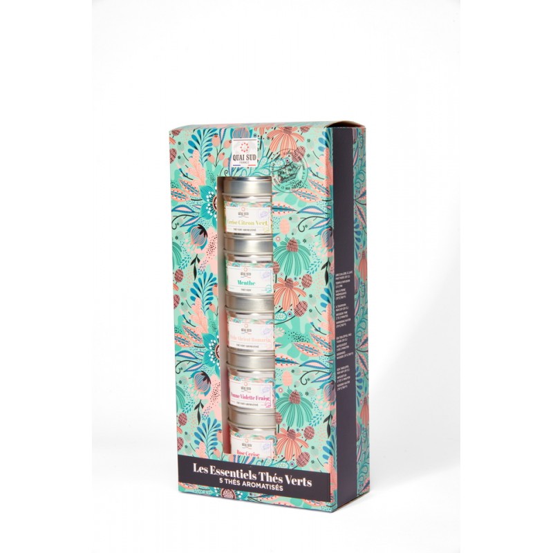 COFFRETS DE THÉS LES ESSENTIELS Thés Verts (Cerise-citron vert. Menthe. Pêche-Abricot-Romarin. Pomme-Fraise-Violette. Eclats de Rose-Cerise) Coffret 5 mini boîtes Pop 5 x 20 g