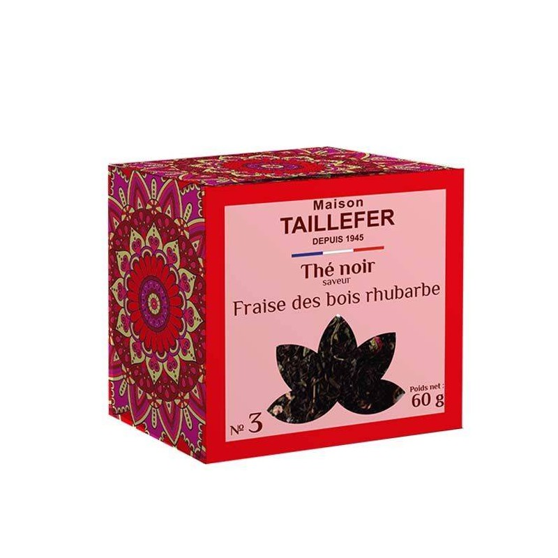 Thé noir n°3 de la Maison Taillefer, un thé aux notes de fraise des bois et de rhubarbe agrémenté de pétales de fleurs. Conditionné en boîte de 60g.