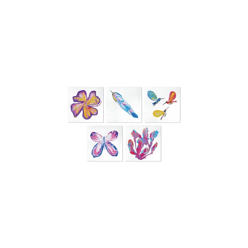Découvre la technique du pouring ! Ce kit créatif permet de réaliser 5 tableaux. À l'aide de l'outil en bambou, de la chaine de microbilles et du fil de coton, applique les différentes peintures afin de créer des mélanges de couleurs. Cela permet de donner forme à des fleurs ou même des papillons. Le livret d'instructions aiguille les enfants pour se familiariser avec le pouring et fournit quelques modèles. Ils pourront également laisser libre cours à leur créativité ! Il faudra environ 3h pour réaliser les 5 tableaux. Ce coffret permet de développer la créativité, et est adapté aux enfants à partir de 8 ans.