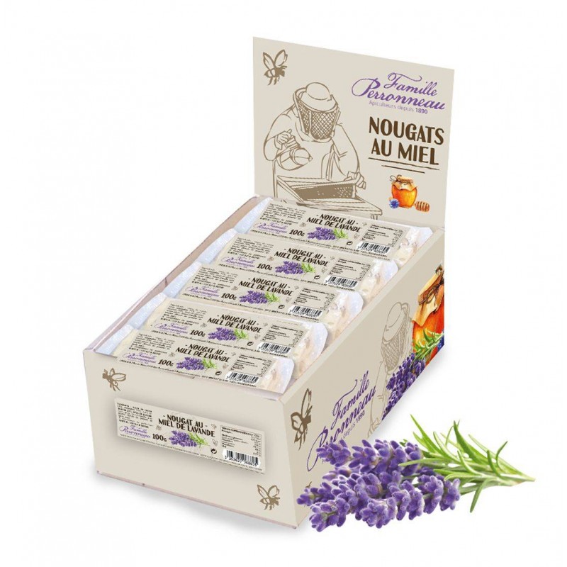 MENTIONS OBLIGATOIRES: Ingrédients: Sucre de canne roux. amandes 21% origine Méditerranéenne. miel de lavande 20%. sirop de glucose (blé garanti sans gluten). sucre glace. blanc d’œuf. pain azyme (fécule de pomme de terre. eau). Conseils de conservation: à conserver à l’abri de la chaleur de et l’humidité. Allergènes: Amandes et œufs. Traces éventuelles d’autres fruits à coque. Acides gras saturés (g): 0.9 Energie (Kcal): 420 Energie (Kj): 1771 Glucides (g): 78.1 Matières grasses (g): 9.7 Protéines (g): 4 Sel (g): 0.02 Sucres (g): 68