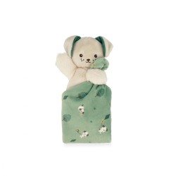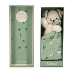 Ce chien de 14cm enveloppé dans un carré de douceur vert de 18 cm, sera le meilleur compagnon de bébé. Un soin particulier a été apporté dans la sélection des matériaux, soit 95% de matières et rembourrage recyclés. Avec son adorable corps moelleux en fourrure, le chien est facile à agripper et tenir par le corps. Le doudou carré entre ses pattes en micro-velours, est habillé d'un délicat imprimé racontant l'histoire d'un petit chien qui joue. La couleur de cet imprimé délicat et poétique se retrouve dans les oreilles du chien et réhausse le tout. Doux comme un nuage, il sera parfait pour câliner bébé et l'étreindre chaleureusement. Présenté dans un bel écrin, ce dernier peut être réutilisé comme étui de rangement. C'est le doudou parfait pour offrir un cadeau en matières recyclées. Lavable en machine à 30°. Dès la naissance.