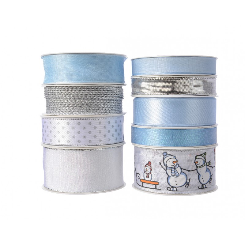 Ruban polyester - 9ass ribbon 1:polyester- Light Blue satin 300 x 2-5 x 0.2 cm ribbon 2: polyester/acetate- snowman white 200 x 4 x 0.2 cm ribbon 3: polyester- Irisee Blue ribbon 400 x 1-5 x 0.2 cm ribbon 4: polyester- Lurex silver Cord 400 x 0.2 x 0.2 cm ribbon 5: polyester- Transparent Light Blue 300 x 2-5 x 0.2 cm ribbon 6: polyester- Light Blue snowflake 400 x 1-5 x 0.2 cm ribbon 7: polyester- Metallic silver ribbon 400 x 1-5 x 0.2 cm ribbon 8: polyester- Irisee White ribbon 200 x 4 x 0.2 cm ribbon 9: polyester- White satin silv.stars 300 x 2-5 x 0.2 cm Décoration:-