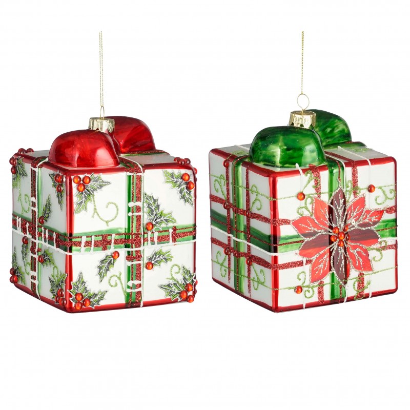 Ornement cadeau verre rouge vert 2 assorti - h12xcm